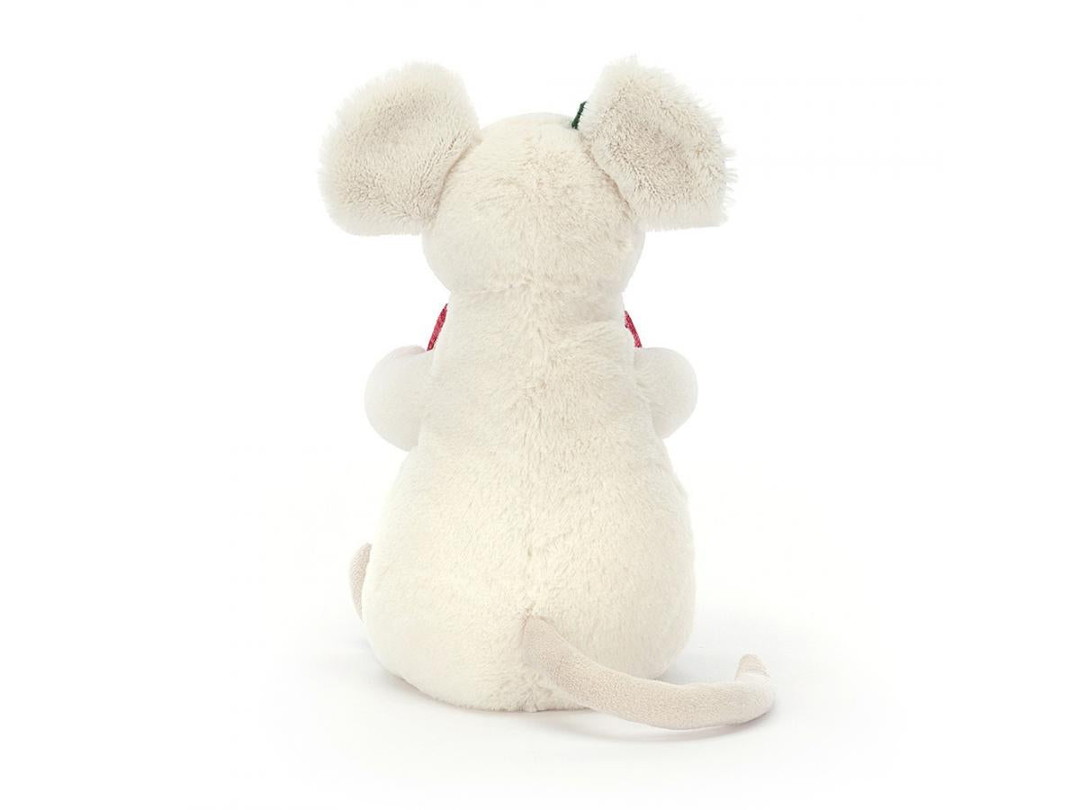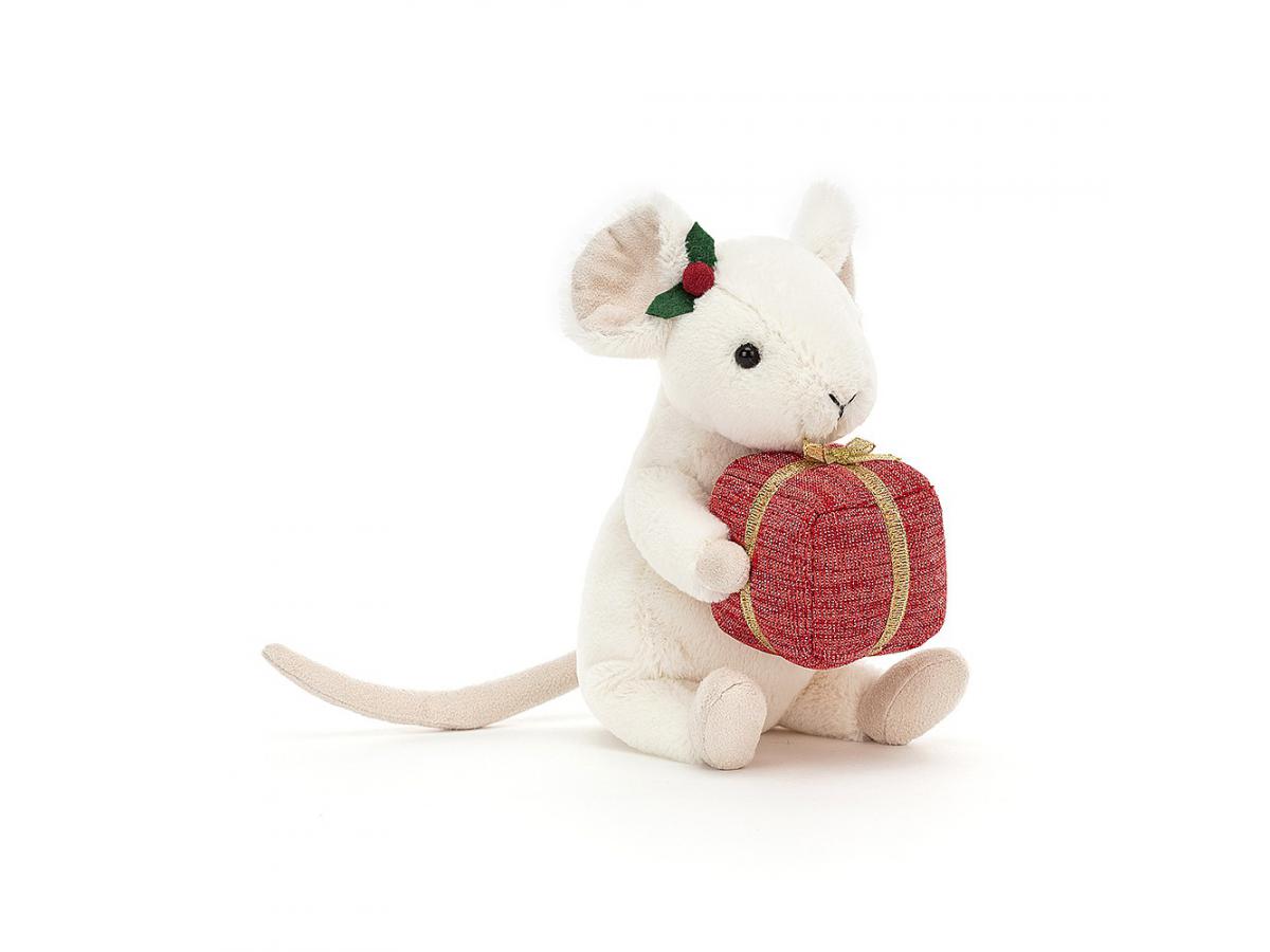 Cette petite souris effrontée tient un petit cadeau de Noël rouge scintillant enveloppé dans un ruban doré étincelant. Elle est blanche avec un mignon nez cousu et une longue queue blanche. Elle a une lueur dans les yeux qui la rend irrésistible. Un brin de houx vert sur l'oreille ajoute une touche festive à l'ensemble. ( Souris )