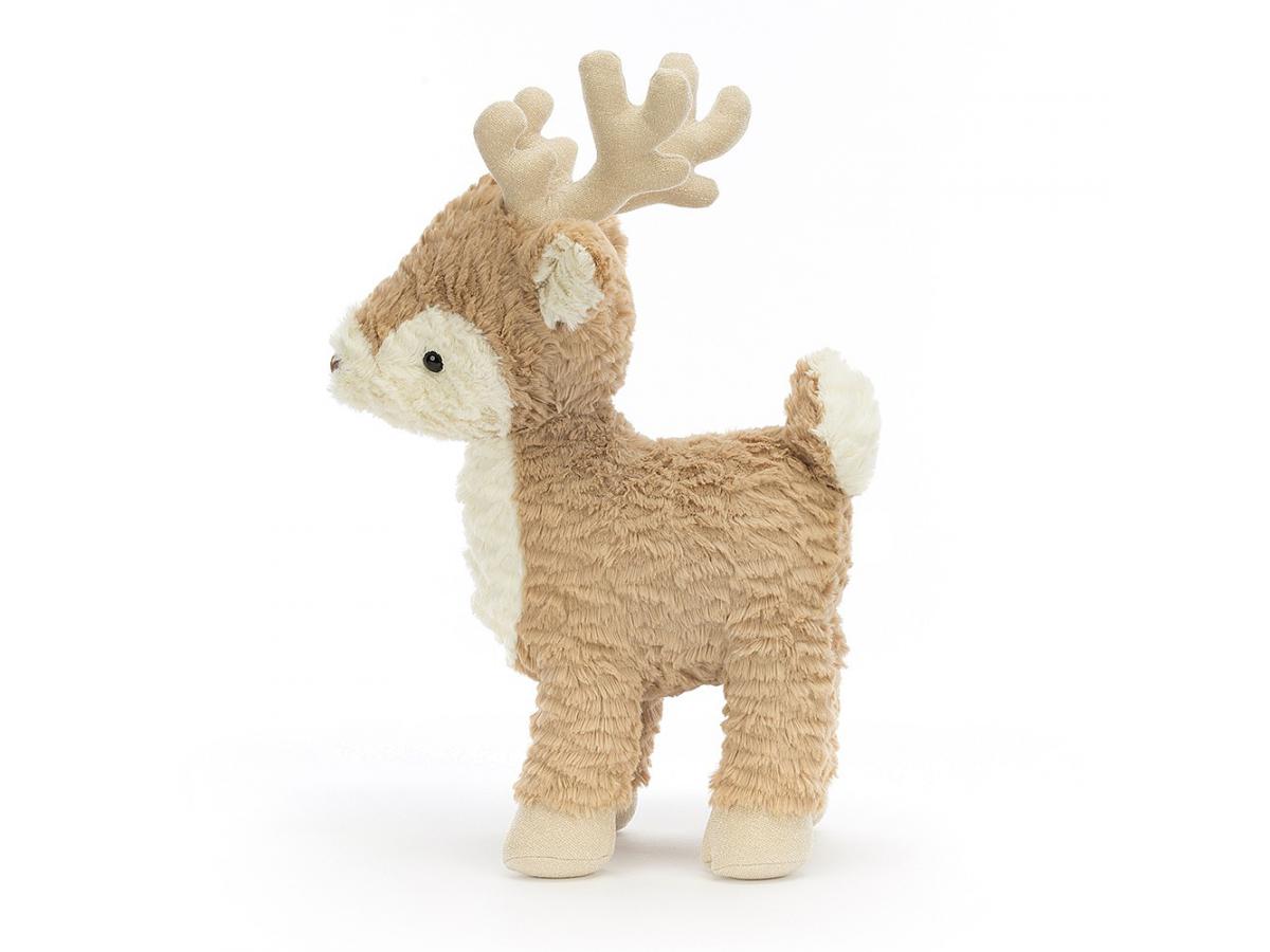 Le renne Mitzi est une délicieuse explosion de fourrure caramel et caramel au beurre ! Cet adorable renne est légèrement ébouriffé, avec des bois étincelants, des sabots fourchus, une petite queue en forme de feuille et de douces oreilles plissées. Mitzi se tient fièrement debout, perdue dans un rêve éveillé de rejoindre un jour l'équipe du Père Noël ! ( Renne )