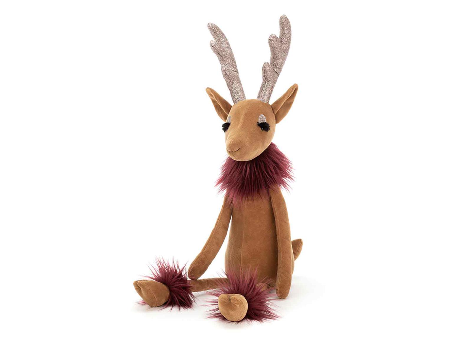 L'élégante Felicity Reindeer est prête à faire la fête, vêtue d'une collerette festive de couleur prune ! Ce renne ocre doux est la reine de la fête, avec un fard à paupières étincelant, de longs cils et des bois éblouissants en or rose. Son nez aux détails soignés et ses oreilles repliées s'accordent à merveille avec ses sabots soyeux ! ( Renne )