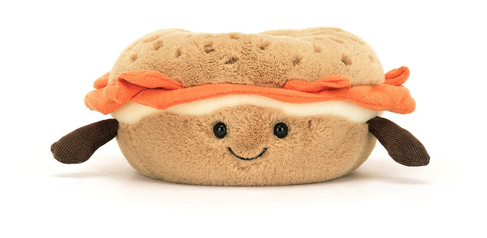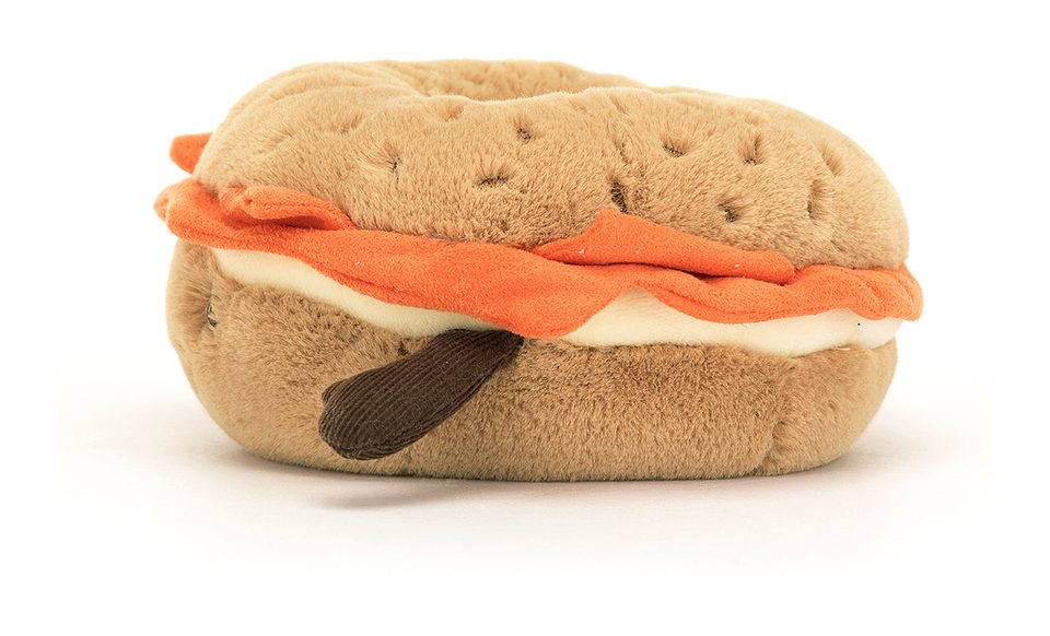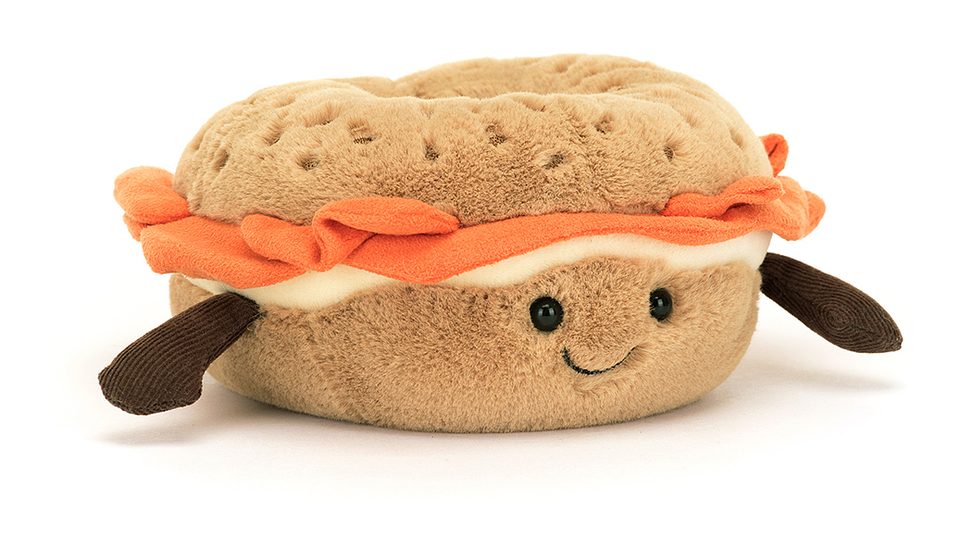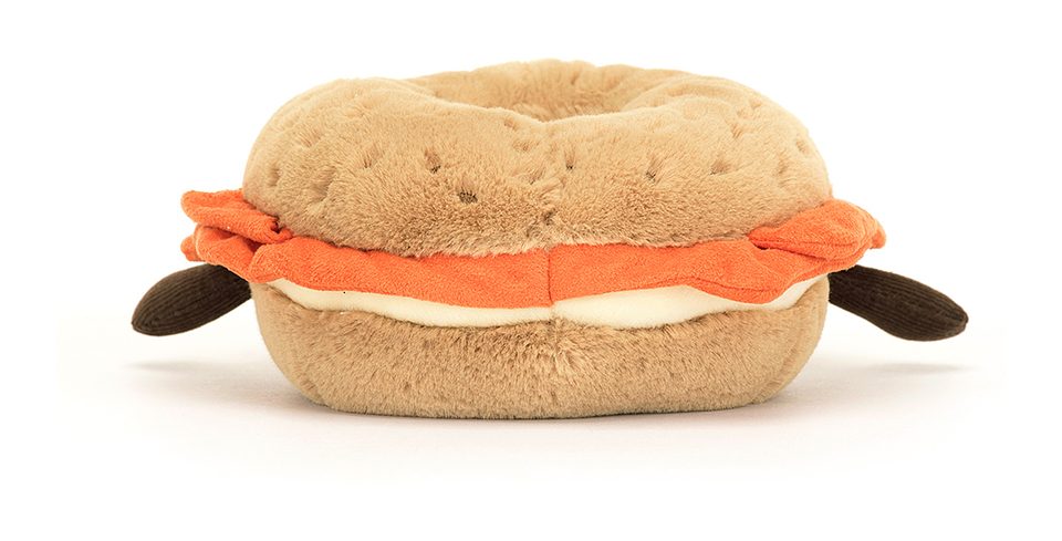 Amuseable Bagel is very soft and pleasant to the touch. The detailed design with the little sesame seeds and the delicious cream filling makes it particularly realistic and adorable. His fun little legs and friendly face give him a special charm that will delight young and old. (Salmon Bagel)