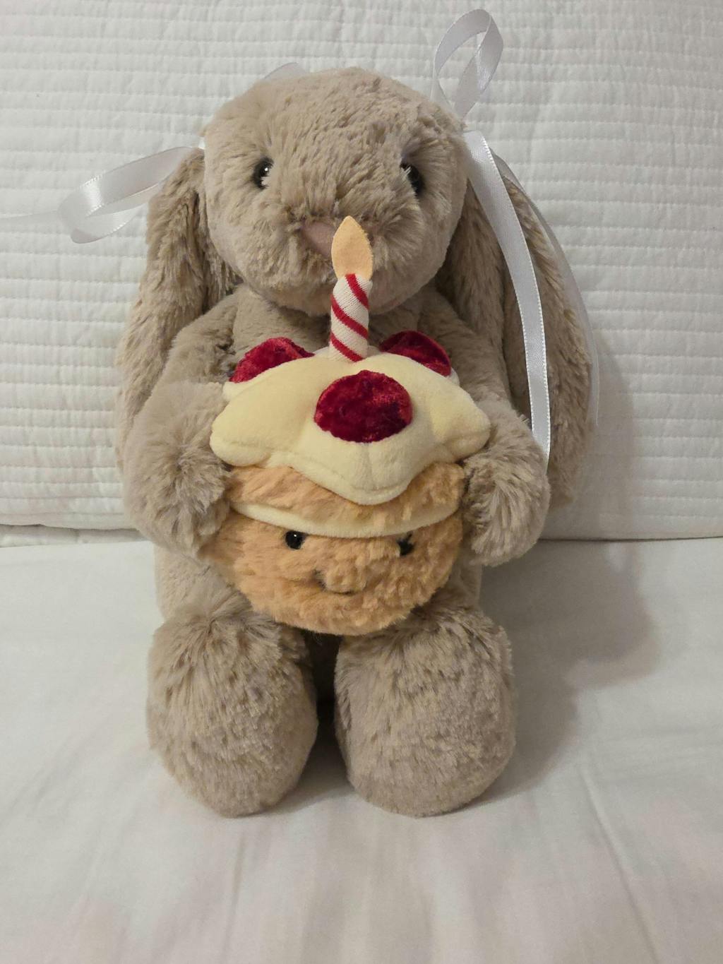 Invita al conejito beige tímido 'Cumpleaños' para las celebraciones más alegres. Suave y tierno con su pelaje beige, nuestro icónico conejito tímido sostiene un pequeño pastel de cumpleaños texturizado de Amuseables, cubierto con glaseado de crema suave, fresas aterciopeladas y una vela rayada ya encendida con una llama de gamuza. (Conejito de pastel)
