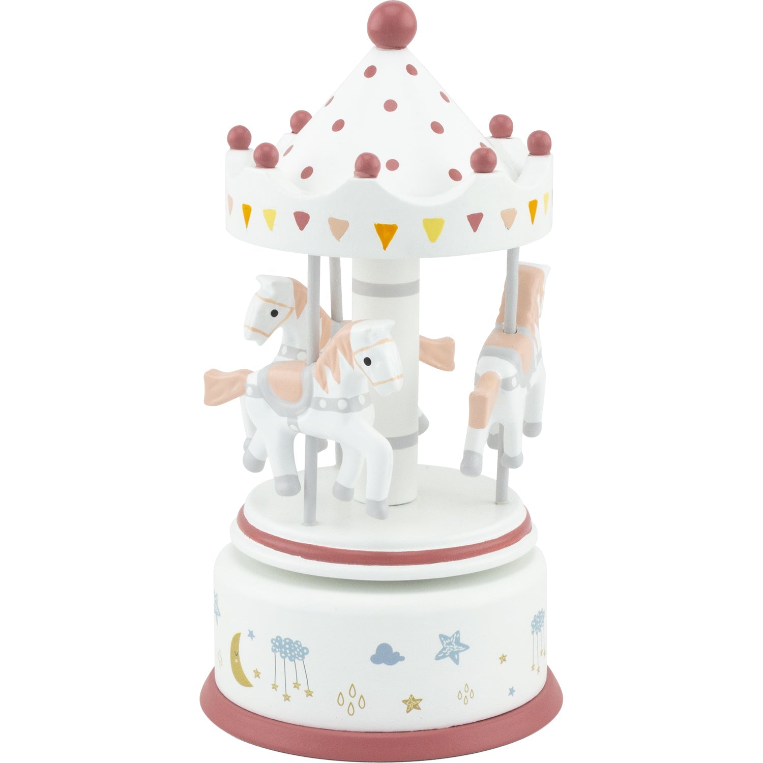 Un carrousel enfant, tout rose et délicat, tournoyant lentement au son enchanteur de "La Vie en Rose" d'Édith Piaf. Le carrousel danse doucement, créant une atmosphère magique et nostalgique. Les rires joyeux des enfants se mêlent à la mélodie intemporelle, créant des souvenirs doux et éternels. C'est comme une scène d'un conte de fées moderne, où la magie réside dans la simplicité et la beauté des petits moments. Ça donne le sourire, n'est-ce pas? ( Carrousel boîte à musique )